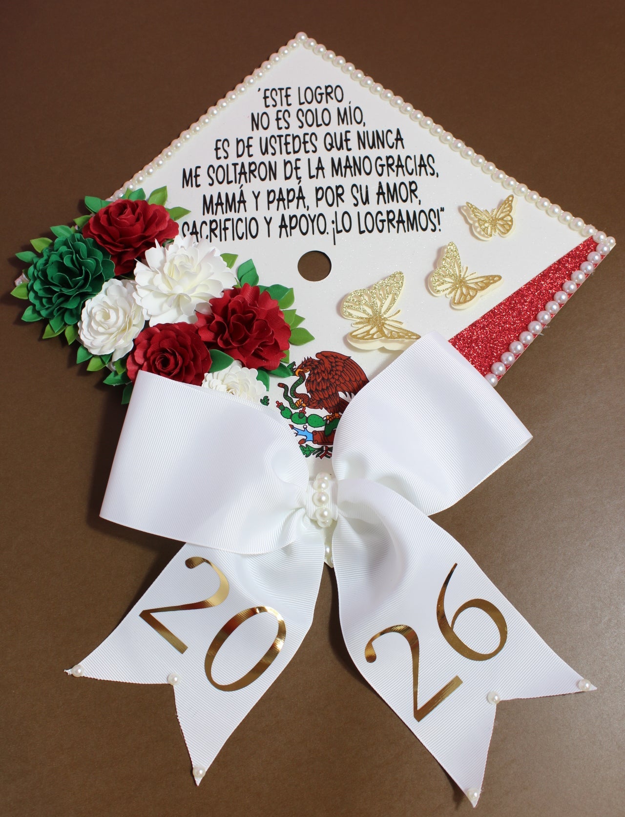 Este topper es perfecto para estudiantes que desean mostrar su orgullo mexicano en su día de graduación con un diseño elegante y llamativo.